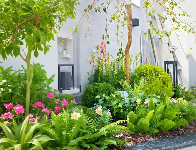 花境的背景设计需要根据设置的场所而定,可以以墙壁或棚栏为背景,但较为理想的还是绿色的树篱或主篱。