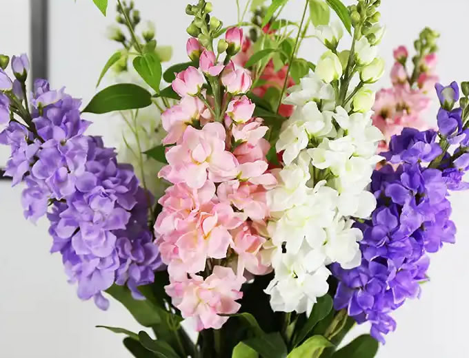 主要栽培品种有白色的‘艾达’(Aida)、淡黄的‘卡门’(Carmen)、红色的‘弗朗西丝卡’(Francesca)、紫色的‘阿贝拉’(Arabella)和淡紫红的‘英卡纳’(Incana)等。依株高分有高、中、矮三类;依花期不同分有夏紫罗兰、秋紫罗兰及冬紫罗兰等品种;依栽培习性不同分一年生及二年生类型。