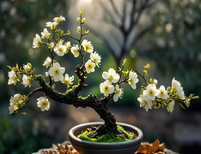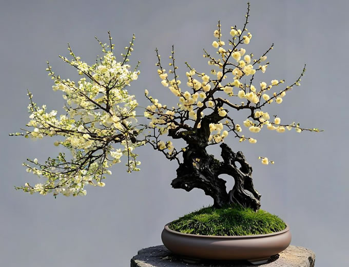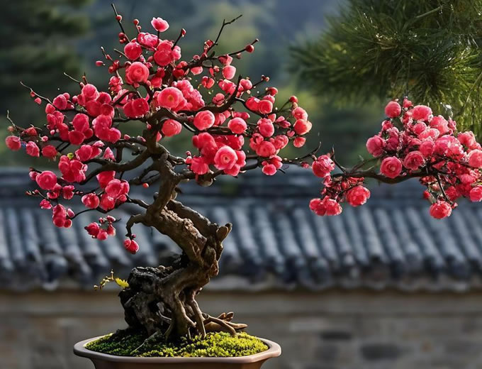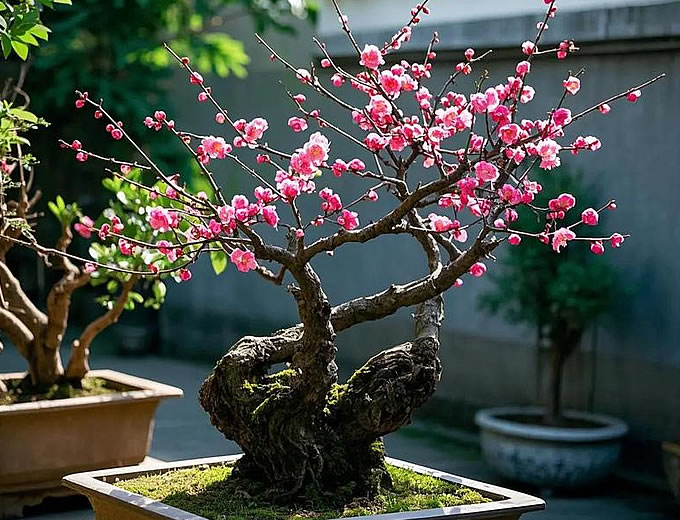 梅花为蔷薇科落叶小乔木。是传统的盆景材料。以老根桩制成的盆景,树姿古雅,骨格清秀,疏枝横斜,虬曲多姿。早春吐蕾放花,幽香宜人,具有形态美、色彩美和风韵美,色、香、味均佳。如配以紫砂古盆,别具风韵。