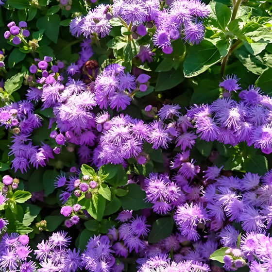 大花藿香蓟是一种多年生草本植物,常作一、二年生栽培,株高30-50厘米,植株丛生紧密,上部多分枝,全株被毛,叶对生、卵圆形、基部心形且具锯齿,表面有褶皱。头状花序聚伞状着生于枝顶,呈半球形缨状,花色丰富,包括蓝色、浅蓝、雪青、粉红、白色等,花期集中在7月至12月。