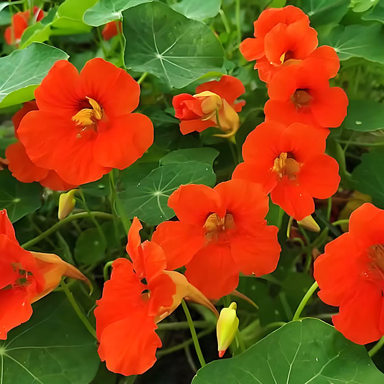 旱金莲是一种蔓生性一年生草本观赏植物,叶片盾状圆形似荷叶,花朵鲜艳呈金黄、橙红或杂色,因花叶形似莲而得名,极具观赏价值,适合盆栽、吊盆或庭院美化。
