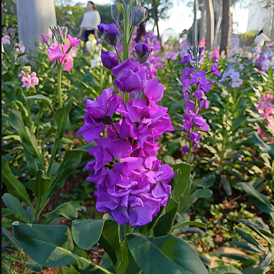 这是最常见的园艺紫罗兰,原产欧洲南部及地中海沿岸,二年生或多年生草本,植株高约60厘米,茎直立多分枝,叶片长圆形或匙形。总状花序顶生,花瓣呈紫红、淡红或白色,花香浓郁,是重要的切花和花坛植物。