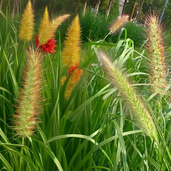 狼尾草是一种多年生草本植物,学名为 Pennisetum alopecuroides,属于禾本科狼尾草属,因其花序形似狼尾而得名。它株高30–120厘米,秆直立丛生,叶片线形,花序直立、密被柔毛,刚毛呈淡绿色或紫色,极具野性美感。