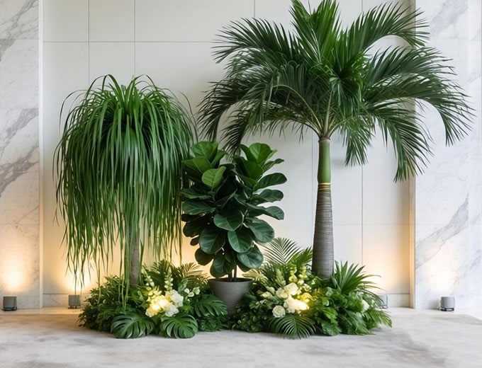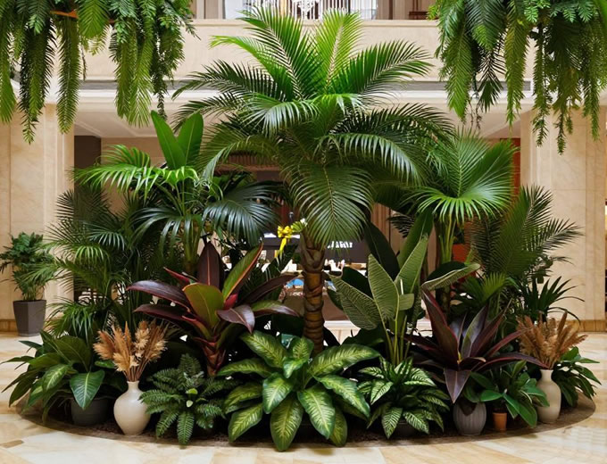 酒店大堂:配置垂叶榕、国王椰子等大型观叶植物,营造气派典雅的迎宾氛围。