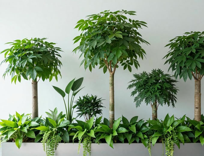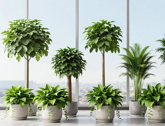 办公室:选用耐阴易养的发财树、棕竹、绿萝,缓解视觉疲劳,提升员工幸福感。