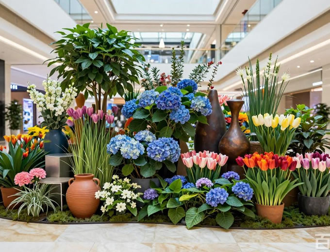 商场中庭:采用组合式花境设计,结合时令花卉与艺术摆件,增强引流效果。