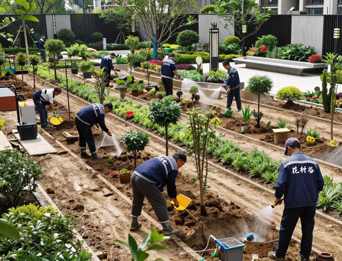 按设计进行乔木、灌木、地被及草坪栽植。关键在于选苗优质、定点准确、深浅适宜,并做好支撑、修剪与初期灌溉。土壤需提前消毒施肥,确保植物成活率。