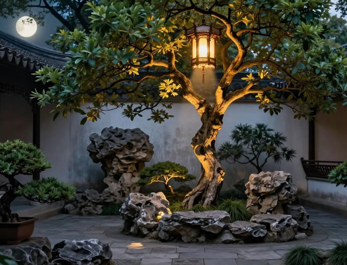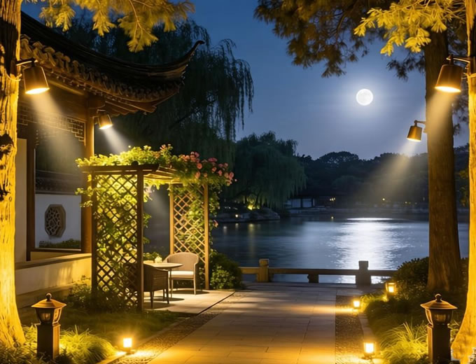 月光照明:将灯具置于高树枝或建筑高处,模拟自然月光洒落效果,营造静谧氛围。