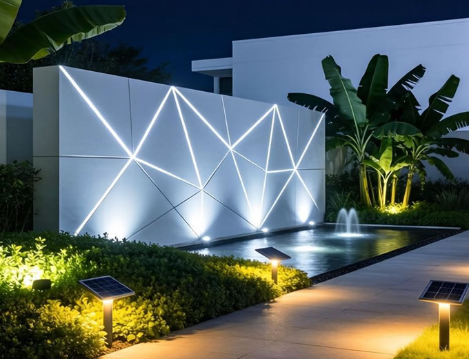 上射照明:从地面向上照亮树木或墙体,突出植物的雕塑感与建筑轮廓,适合乔木、景墙。